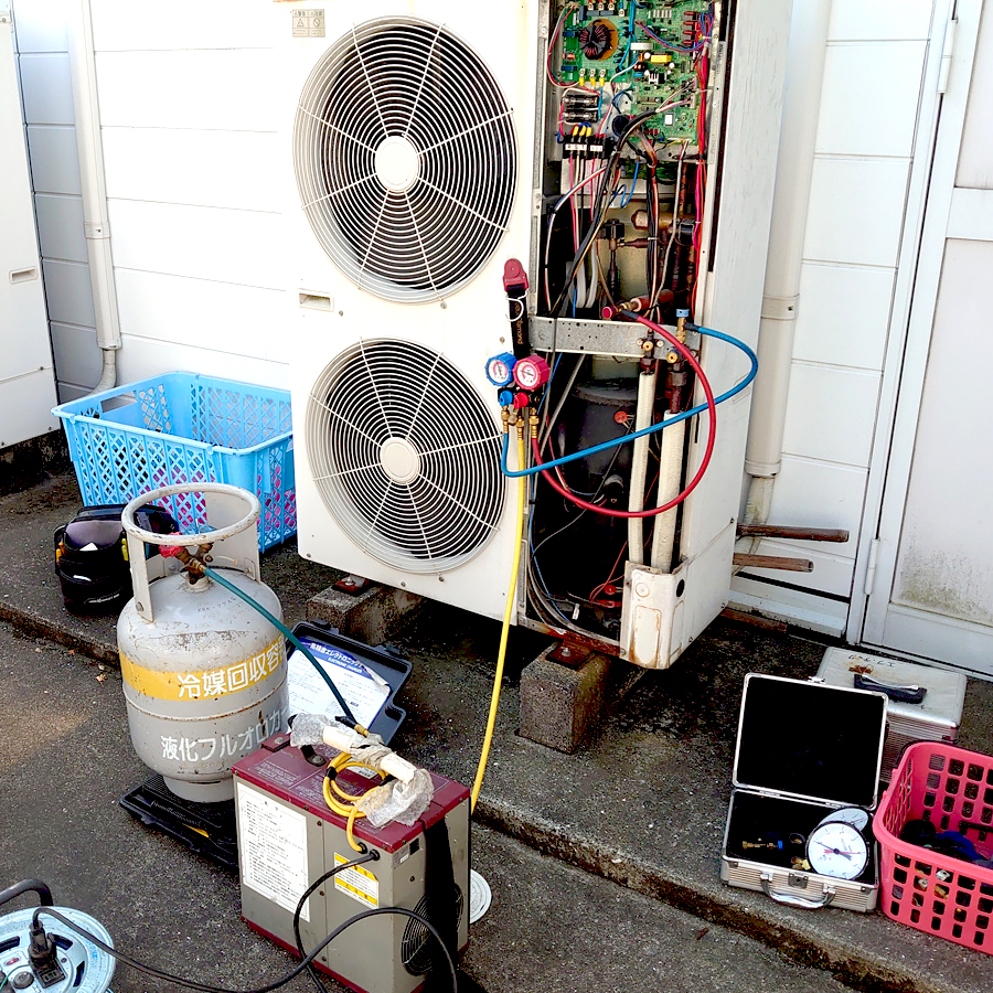 私たちは鹿児島県内で空調設備全般(取付・取り外し、洗浄等)をメインに取り扱っており、冷媒ガス(フロンガス)回収作業なども対応しております。